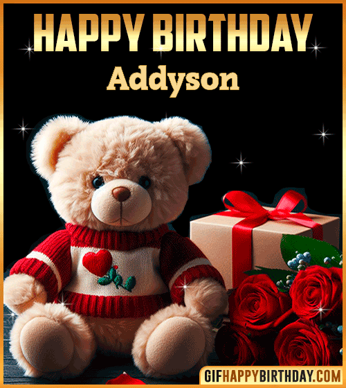 Send warm and cozy wishes to Addyson with this charming teddy bear Happy Birthday GIF! 🧸🎁 The cute bear in a red sweater sits beside a gift box and roses, creating the perfect blend of sweetness and love. Ideal for sharing tenderness, friendship, and heartfelt birthday vibes. ❤️