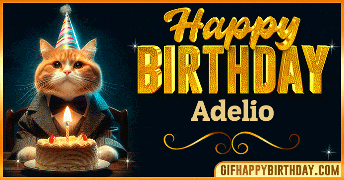 Celebrate Adelio’s special day with this elegant Happy Birthday GIF — a classy cat in a bow tie enjoying a birthday cake under warm lights. Perfect to share love, smiles, and birthday wishes! 🎂