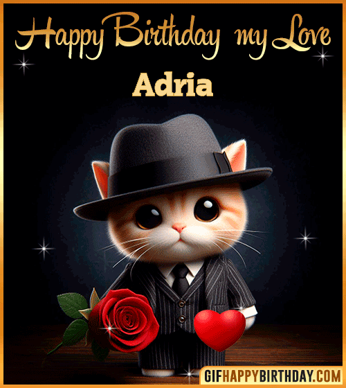 Surprise your special someone with this romantic Happy Birthday GIF! 💕🐾 A charming kitten dressed elegantly with a rose and heart sends warm, loving wishes to Adria. Perfect to express affection, sweetness, and deep love on their special day. 🌹