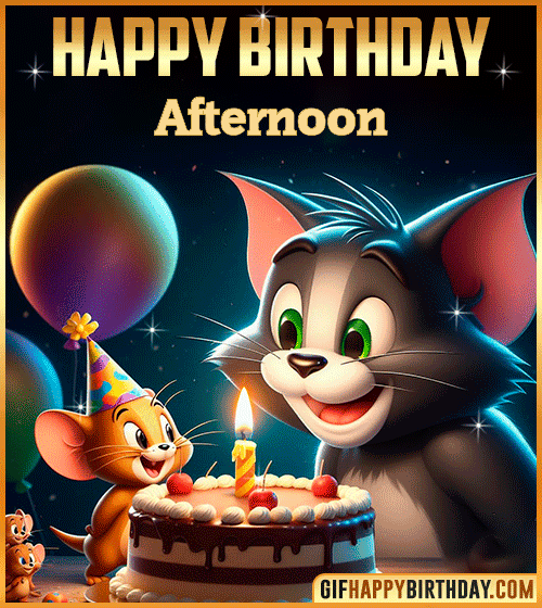 A fun and cheerful animated GIF featuring Tom and Jerry celebrating Afternoon’s birthday! 🎉 The iconic duo stands happily beside a delicious cake with a glowing candle, ready to party and share laughter. Perfect for sending playful birthday wishes full of joy, friendship, and nostalgia. Great to share on WhatsApp, Facebook, or Instagram to make someone’s day extra special. 🎂🎈