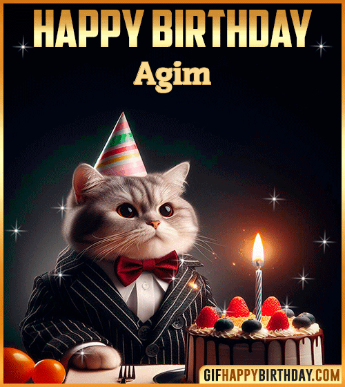 Celebrate Agim’s special day with this elegant Happy Birthday GIF — a classy cat in a bow tie enjoying a birthday cake under warm lights. Perfect to share love, smiles, and birthday wishes! 🎂