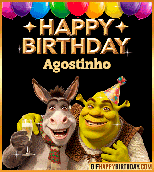 A hilarious and joyful animated GIF featuring Shrek and Donkey celebrating a birthday in style! 🥂🎉 With big smiles, party hats, and balloons above, they toast to Agostinho’s special day with festive energy and fun. Perfect for fans of humor, animation, or those who love sending cheerful birthday greetings with a twist of laughter and friendship!