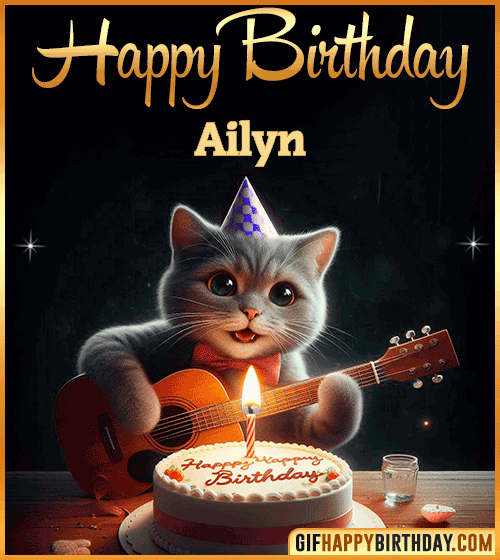 Celebrate Ailyn’s birthday with music and smiles! 🎶🐱 This adorable Happy Birthday GIF shows a charming cat in a party hat strumming the guitar next to a glowing cake — the perfect mix of fun, warmth, and celebration to share on social media or WhatsApp. 🎂