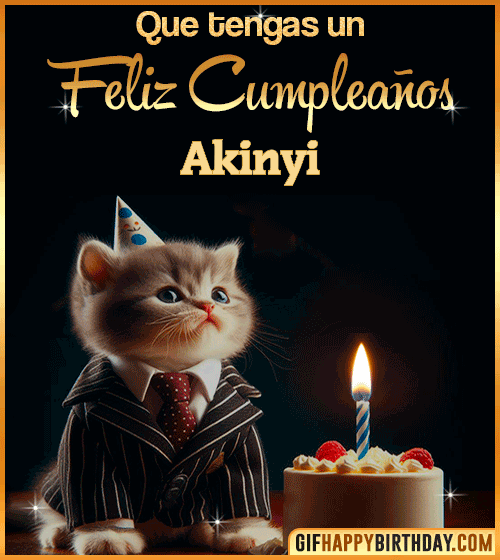 Este adorable GIF es perfecto para desearle a Akinyi un cumpleaños lleno de alegría y ternura. 🎉🐾 El simpático gatito, vestido con elegancia, acompaña un delicioso pastel con vela encendida para celebrar un día muy especial. Ideal para compartir en redes, mensajes o estados con un toque dulce y original. 🎂
