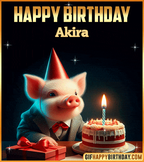 Send smiles to Akira with this adorable Happy Birthday GIF — a cute pig in a suit and party hat celebrating with cake, candle, and a gift box. Perfect to share on WhatsApp, Facebook, or Instagram to spread fun and joy! 🎂