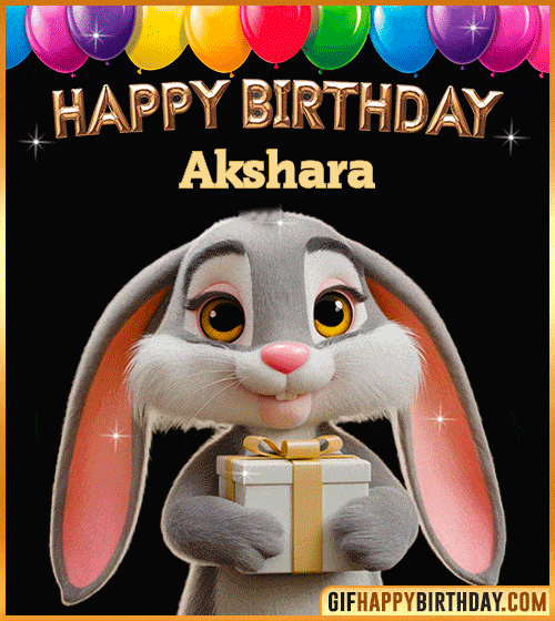 A charming animated GIF featuring a sweet bunny wishing Akshara a Happy Birthday! 🎈 The cute rabbit, with big sparkling eyes and a friendly smile, holds a beautiful present wrapped with a golden bow. Perfect for sending warm and cheerful birthday wishes to kids or animal lovers.