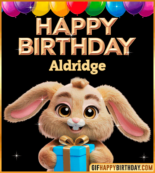 A charming animated GIF featuring a sweet bunny wishing Aldridge a Happy Birthday! 🎈 The cute rabbit, with big sparkling eyes and a friendly smile, holds a beautiful present wrapped with a golden bow. Perfect for sending warm and cheerful birthday wishes to kids or animal lovers.