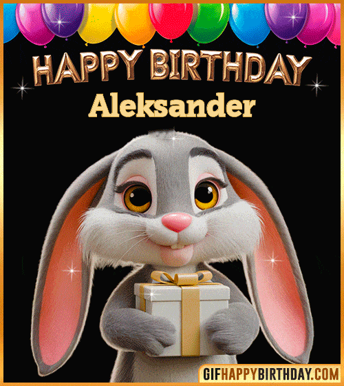 A charming animated GIF featuring a sweet bunny wishing Aleksander a Happy Birthday! 🎈 The cute rabbit, with big sparkling eyes and a friendly smile, holds a beautiful present wrapped with a golden bow. Perfect for sending warm and cheerful birthday wishes to kids or animal lovers.