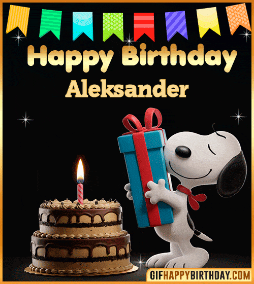 A lovely animated GIF to wish Aleksander a joyful birthday! 🎉 Snoopy appears with his classic charm, holding a bright present beside a delicious chocolate cake topped with a glowing candle. This sweet and cheerful image is perfect for sending birthday wishes full of warmth, love, and smiles. Ideal to share on WhatsApp, Facebook, or Instagram. 🎂