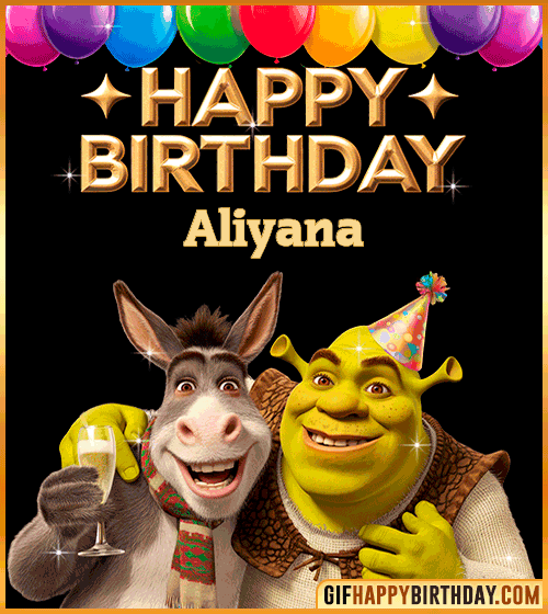 A hilarious and joyful animated GIF featuring Shrek and Donkey celebrating a birthday in style! 🥂🎉 With big smiles, party hats, and balloons above, they toast to Aliyana’s special day with festive energy and fun. Perfect for fans of humor, animation, or those who love sending cheerful birthday greetings with a twist of laughter and friendship!