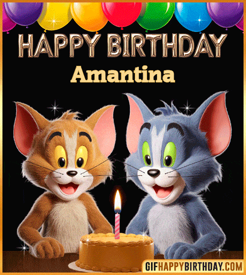 A fun and cheerful animated GIF featuring Tom and Jerry celebrating Amantina’s birthday! 🎉 The iconic duo stands happily beside a delicious cake with a glowing candle, ready to party and share laughter. Perfect for sending playful birthday wishes full of joy, friendship, and nostalgia. Great to share on WhatsApp, Facebook, or Instagram to make someone’s day extra special. 🎂🎈