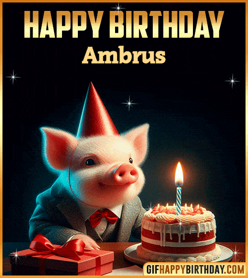 Send smiles to Ambrus with this adorable Happy Birthday GIF — a cute pig in a suit and party hat celebrating with cake, candle, and a gift box. Perfect to share on WhatsApp, Facebook, or Instagram to spread fun and joy! 🎂