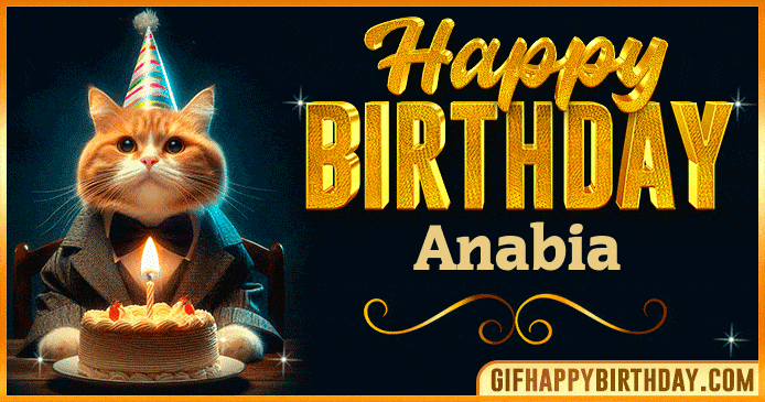 Celebrate Anabia’s special day with this elegant Happy Birthday GIF — a classy cat in a bow tie enjoying a birthday cake under warm lights. Perfect to share love, smiles, and birthday wishes! 🎂