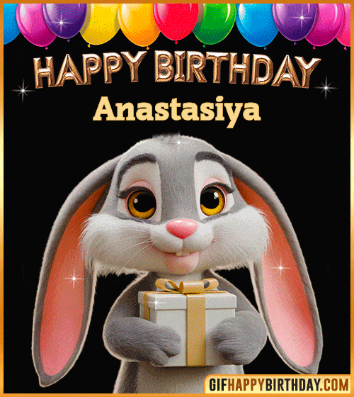 A charming animated GIF featuring a sweet bunny wishing Anastasiya a Happy Birthday! 🎈 The cute rabbit, with big sparkling eyes and a friendly smile, holds a beautiful present wrapped with a golden bow. Perfect for sending warm and cheerful birthday wishes to kids or animal lovers.