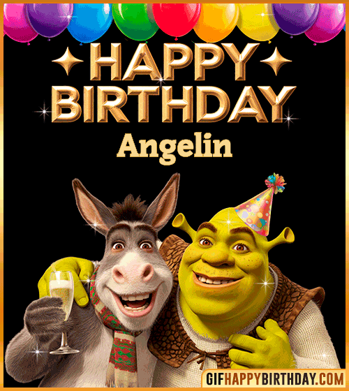 A hilarious and joyful animated GIF featuring Shrek and Donkey celebrating a birthday in style! 🥂🎉 With big smiles, party hats, and balloons above, they toast to Angelin’s special day with festive energy and fun. Perfect for fans of humor, animation, or those who love sending cheerful birthday greetings with a twist of laughter and friendship!
