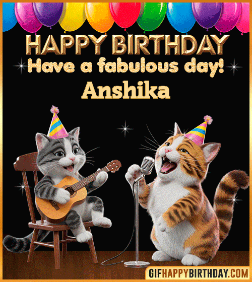A hilarious and heartwarming animated GIF featuring two adorable cats putting on a musical performance to celebrate Anshika’s birthday! 🎶🐾 One cat strums the guitar while the other sings passionately into a microphone, both dressed in party hats with vibrant balloons overhead. Perfect for sharing with cat lovers or anyone who enjoys a fun and cheerful birthday surprise.