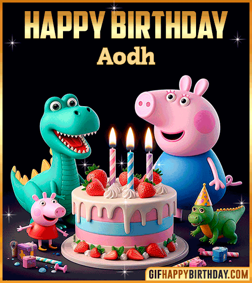Bring smiles to Aodh’s special day with this adorable Peppa Pig Happy Birthday GIF! 🐷🎂 Perfect for kids and Peppa fans, it shows Peppa and her friends celebrating around a delicious cake with balloons, gifts, and joy. A fun and colorful way to send happy wishes online! 🎉