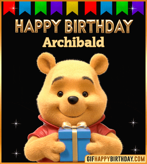 A cute and heartwarming animated GIF featuring Winnie the Pooh celebrating Archibald’s special day! 🎈 The adorable bear smiles sweetly while holding a blue present, ready to share love, joy, and honey-sweet birthday wishes. Perfect for sending warm greetings filled with friendship and happiness. 🎁