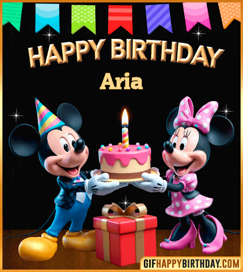 Brighten Aria’s special day with this cheerful Happy Birthday GIF — Mickey and Minnie Mouse smiling beside a festive cake, balloons, and presents. Perfect for sharing fun birthday vibes with friends and family! 🎂🎁🎈