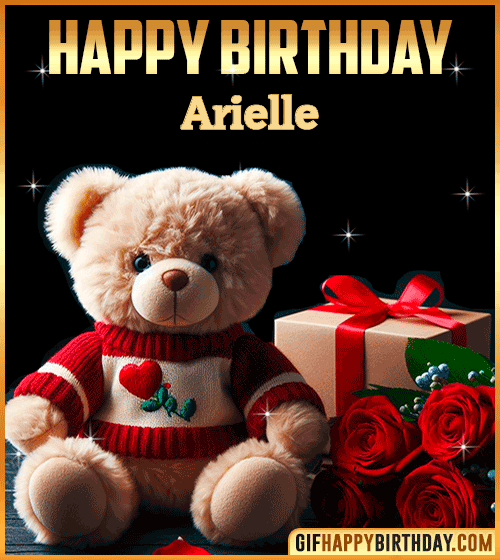 Send warm and cozy wishes to Arielle with this charming teddy bear Happy Birthday GIF! 🧸🎁 The cute bear in a red sweater sits beside a gift box and roses, creating the perfect blend of sweetness and love. Ideal for sharing tenderness, friendship, and heartfelt birthday vibes. ❤️