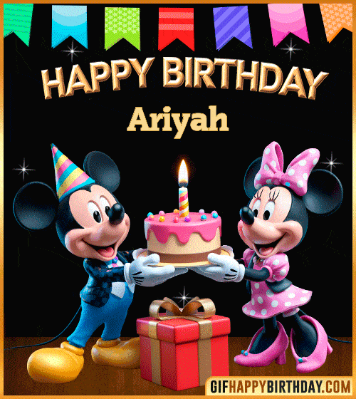 Brighten Ariyah’s special day with this cheerful Happy Birthday GIF — Mickey and Minnie Mouse smiling beside a festive cake, balloons, and presents. Perfect for sharing fun birthday vibes with friends and family! 🎂🎁🎈