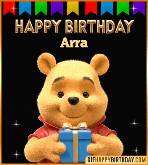 A cute and heartwarming animated GIF featuring Winnie the Pooh celebrating Arra’s special day! 🎈 The adorable bear smiles sweetly while holding a blue present, ready to share love, joy, and honey-sweet birthday wishes. Perfect for sending warm greetings filled with friendship and happiness. 🎁
