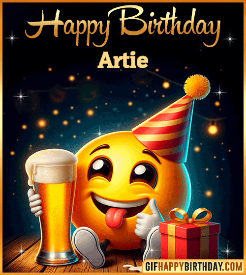 Celebrate Artie’s birthday with this funny emoji Happy Birthday GIF! 🍻😄 The cheerful emoji raises a beer in one hand and holds a wrapped gift in the other — perfect for sending fun, laughter, and good vibes on this special day. Ideal for friends who love to party and smile big! 🎉