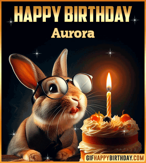 A charming animated GIF featuring a sweet bunny wishing Aurora a Happy Birthday! 🎈 The cute rabbit, with big sparkling eyes and a friendly smile, holds a beautiful present wrapped with a golden bow. Perfect for sending warm and cheerful birthday wishes to kids or animal lovers.