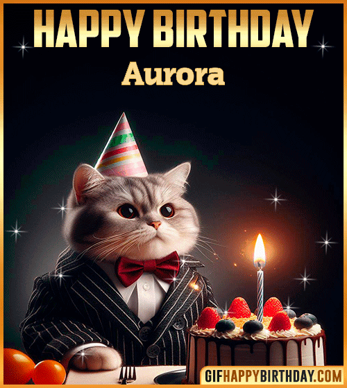 Celebrate Aurora’s special day with this elegant Happy Birthday GIF — a classy cat in a bow tie enjoying a birthday cake under warm lights. Perfect to share love, smiles, and birthday wishes! 🎂
