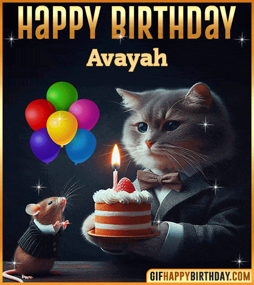 Celebrate Avayah’s special day with this elegant Happy Birthday GIF — a classy cat in a bow tie enjoying a birthday cake under warm lights. Perfect to share love, smiles, and birthday wishes! 🎂