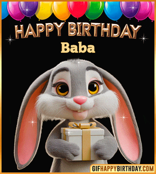 A charming animated GIF featuring a sweet bunny wishing Baba a Happy Birthday! 🎈 The cute rabbit, with big sparkling eyes and a friendly smile, holds a beautiful present wrapped with a golden bow. Perfect for sending warm and cheerful birthday wishes to kids or animal lovers.