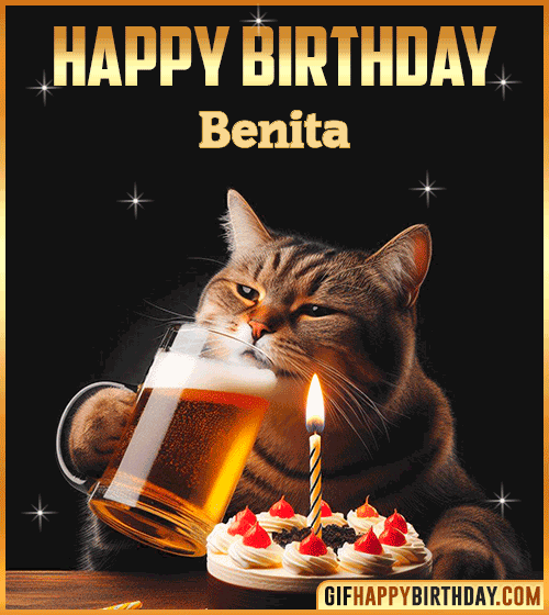 Cheers to Benita on their special day! 🍻🐱 This funny cat Happy Birthday GIF brings laughter and good vibes — a cool cat toasting with beer and cake to celebrate in style. Perfect for sharing humor, friendship, and a relaxed birthday mood. 🎂