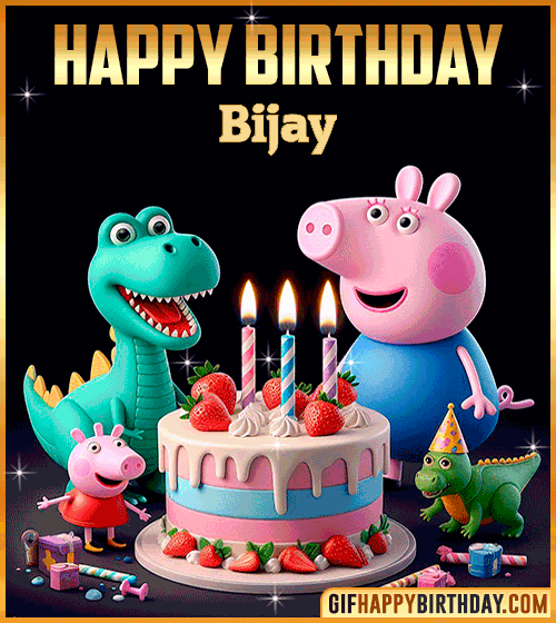 Bring smiles to Bijay’s special day with this adorable Peppa Pig Happy Birthday GIF! 🐷🎂 Perfect for kids and Peppa fans, it shows Peppa and her friends celebrating around a delicious cake with balloons, gifts, and joy. A fun and colorful way to send happy wishes online! 🎉