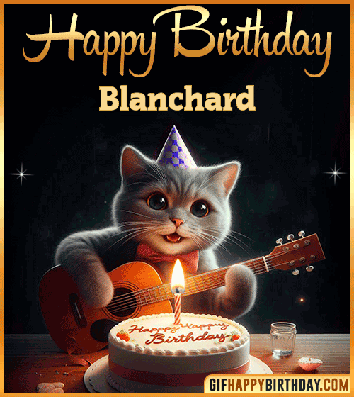 Celebrate Blanchard’s birthday with music and smiles! 🎶🐱 This adorable Happy Birthday GIF shows a charming cat in a party hat strumming the guitar next to a glowing cake — the perfect mix of fun, warmth, and celebration to share on social media or WhatsApp. 🎂