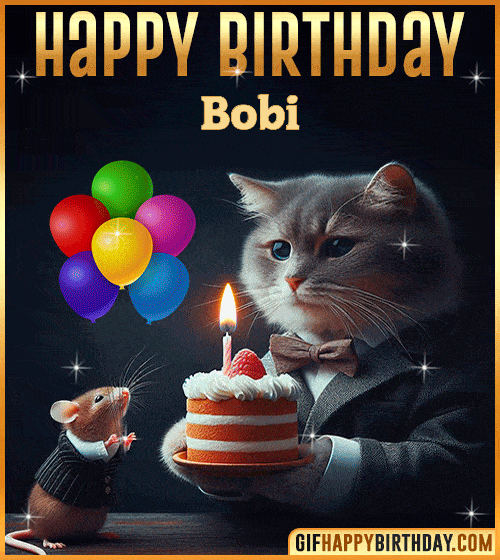 Celebrate Bobi’s special day with this elegant Happy Birthday GIF — a classy cat in a bow tie enjoying a birthday cake under warm lights. Perfect to share love, smiles, and birthday wishes! 🎂