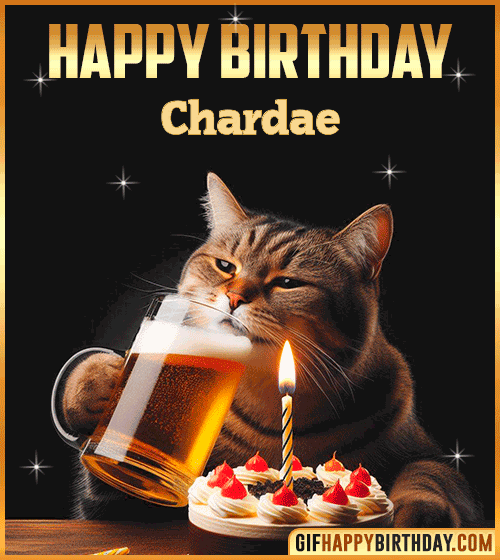 Cheers to Chardae on their special day! 🍻🐱 This funny cat Happy Birthday GIF brings laughter and good vibes — a cool cat toasting with beer and cake to celebrate in style. Perfect for sharing humor, friendship, and a relaxed birthday mood. 🎂