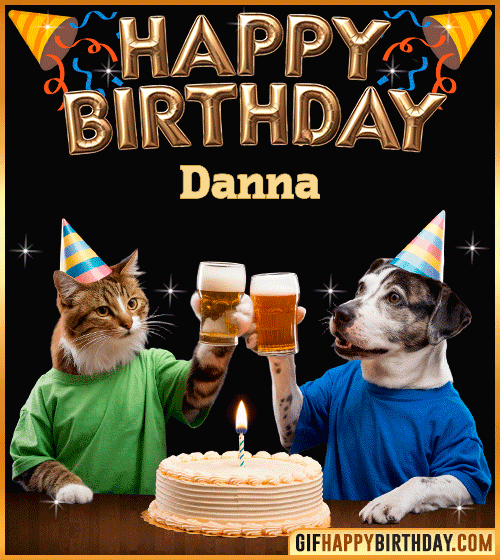 Make Danna’s day brighter with this adorable Happy Birthday GIF — a charming dog and cat dressed up for the party, ready to celebrate with joy, cake, and friendship! 🎉