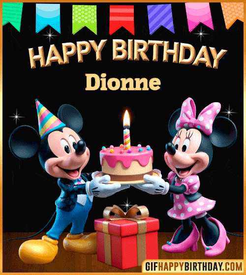 Brighten Dionne’s special day with this cheerful Happy Birthday GIF — Mickey and Minnie Mouse smiling beside a festive cake, balloons, and presents. Perfect for sharing fun birthday vibes with friends and family! 🎂🎁🎈