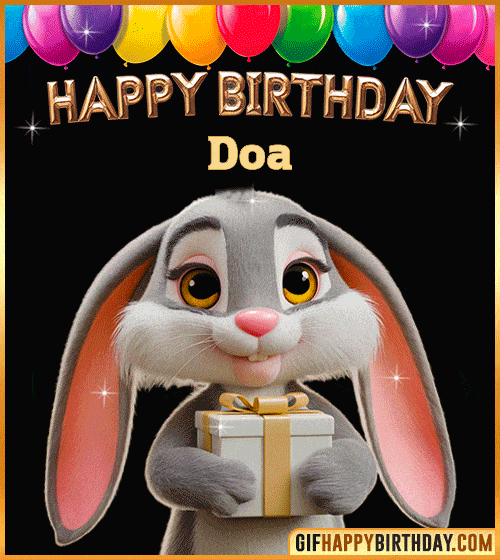A charming animated GIF featuring a sweet bunny wishing Doa a Happy Birthday! 🎈 The cute rabbit, with big sparkling eyes and a friendly smile, holds a beautiful present wrapped with a golden bow. Perfect for sending warm and cheerful birthday wishes to kids or animal lovers.