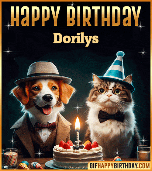 Make Dorilys’s day brighter with this adorable Happy Birthday GIF — a charming dog and cat dressed up for the party, ready to celebrate with joy, cake, and friendship! 🎉