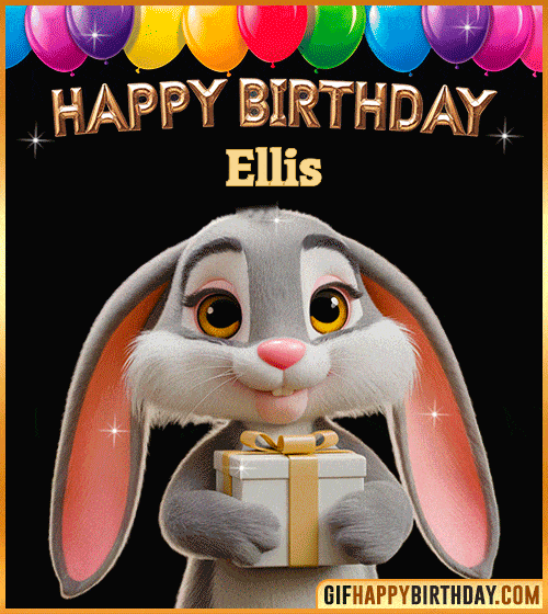 A charming animated GIF featuring a sweet bunny wishing Ellis a Happy Birthday! 🎈 The cute rabbit, with big sparkling eyes and a friendly smile, holds a beautiful present wrapped with a golden bow. Perfect for sending warm and cheerful birthday wishes to kids or animal lovers.