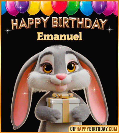 A charming animated GIF featuring a sweet bunny wishing Emanuel a Happy Birthday! 🎈 The cute rabbit, with big sparkling eyes and a friendly smile, holds a beautiful present wrapped with a golden bow. Perfect for sending warm and cheerful birthday wishes to kids or animal lovers.