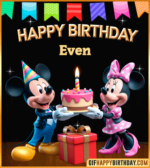 Brighten Even’s special day with this cheerful Happy Birthday GIF — Mickey and Minnie Mouse smiling beside a festive cake, balloons, and presents. Perfect for sharing fun birthday vibes with friends and family! 🎂🎁🎈