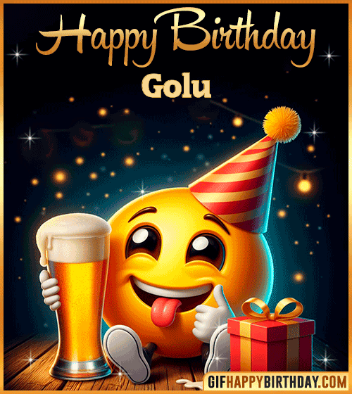 Celebrate Golu’s birthday with this funny emoji Happy Birthday GIF! 🍻😄 The cheerful emoji raises a beer in one hand and holds a wrapped gift in the other — perfect for sending fun, laughter, and good vibes on this special day. Ideal for friends who love to party and smile big! 🎉