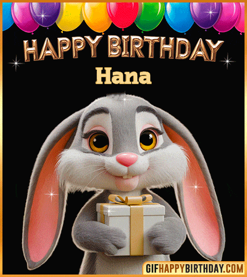 A charming animated GIF featuring a sweet bunny wishing Hana a Happy Birthday! 🎈 The cute rabbit, with big sparkling eyes and a friendly smile, holds a beautiful present wrapped with a golden bow. Perfect for sending warm and cheerful birthday wishes to kids or animal lovers.