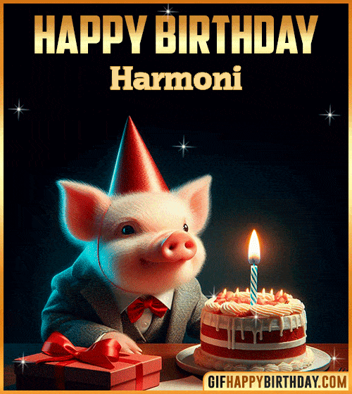 Send smiles to Harmoni with this adorable Happy Birthday GIF — a cute pig in a suit and party hat celebrating with cake, candle, and a gift box. Perfect to share on WhatsApp, Facebook, or Instagram to spread fun and joy! 🎂