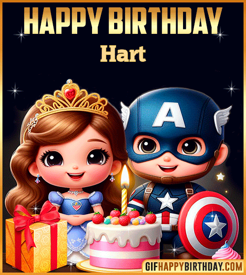 Bring smiles to Hart’s special day with this adorable Happy Birthday GIF! 🎂💫 Captain America joins a sweet princess for a joyful celebration full of gifts, cake, and sparkle. Perfect for sharing fun birthday wishes with kids and superhero fans alike! 🎁