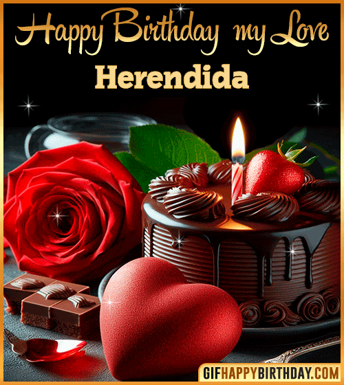 Make your special someone feel loved with this romantic Happy Birthday GIF! 💞🍰 A rich chocolate cake topped with strawberries and a glowing candle, beside a red rose and a heart — the perfect combination of sweetness and passion to say Happy Birthday, my love Herendida! 🌹✨ Ideal to share heartfelt wishes filled with romance and tenderness.
