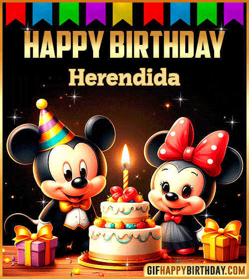 Brighten Herendida’s special day with this cheerful Happy Birthday GIF — Mickey and Minnie Mouse smiling beside a festive cake, balloons, and presents. Perfect for sharing fun birthday vibes with friends and family! 🎂🎁🎈