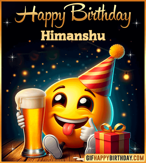Celebrate Himanshu’s birthday with this funny emoji Happy Birthday GIF! 🍻😄 The cheerful emoji raises a beer in one hand and holds a wrapped gift in the other — perfect for sending fun, laughter, and good vibes on this special day. Ideal for friends who love to party and smile big! 🎉